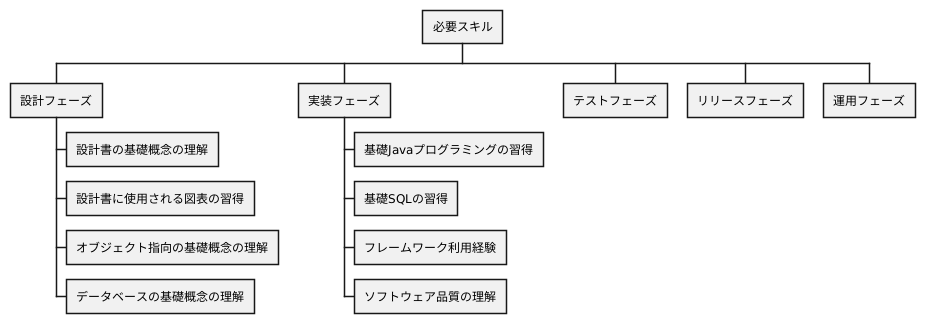 設計フェーズ設計書の基礎概念の理解設計書に使用される図表の習得オブジェクト指向の基礎概念の理解データベースの基礎概念の理解実装フェーズ基礎Javaプログラミングの習得基礎SQLの習得フレームワーク利用経験ソフトウェア品質の理解テストフェーズリリースフェーズ運用フェーズ必要スキル